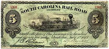 The South Carolina Rail Road Company was a railroad company that operated in South Carolina from 1843 to 1894, when it was succeeded by the Southern Railway. It was formed in 1844 by the merger of the South Carolina Canal and Rail Road Company (SCC&RR) into the Louisville, Cincinnati and Charleston Railroad Company. It was built with a track gauge of 5 ft (1,524 mm).[2]