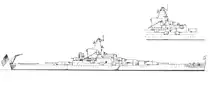 Arguments arose, frequently over the issue of speed; the Commander in Chief, United States Fleet (CINCUS) refused to allow the new ship to drop below 25 knots (46 km/h; 29 mph), the Battle Force argued at least 27 knots (50 km/h; 31 mph) was necessary to maintain homogeneity in the line of battle, and the president of the War College maintained a fast ship was optimal, but the navy would continue to operate the older 21 knots (39 km/h; 24 mph) battleships until the 1950s and so a higher speed was not strictly necessary—though, crucially, it would mean the class would have been too slow to act in what would emerge as the most critical role for battleships, as escorts for fast carrier task forces. The primary 666-ft design was the only plan that could meet the specified requirements for speed, protection, and the nine 16-inch guns.[8] By late 1937 a proposed design was agreed on, requiring only small modifications to save weight and increase the fields of fire.[9] Berths for the crew, even the staterooms for senior officers, along with mess halls were reduced in size, and ventilation ports were completely removed, forcing the ship to rely completely on artificial air circulation.[10]
