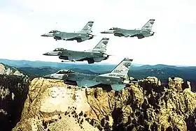 ![]() Four-ship F-16 formation of the 175th Fighter Squadron "Lobos" from Sioux Falls AGB over Mount Rushmore. The 175th is the oldest unit in the South Dakota Air National Guard, having over 60 years of service to the state and nation. | |