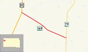 South Dakota Highway 168 (SD 168) is a state highway in Butte County in the U.S. state of South Dakota. It runs from U.S. Route 85 (US 85) to SD 79. The highway is maintained by the South Dakota Department of Transportation (SDDOT), and is not part of the National Highway System.