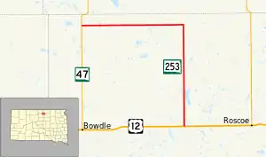 South Dakota Highway 253 (SD 253) is an 18.024-mile-long (29.007 km) state highway in the north-central part of the U.S. state of South Dakota. It exists entirely within Edmunds County, from U.S. Route 12 (US 12) west of Roscoe to SD 47 north of Bowdle. The route is maintained by the South Dakota Department of Transportation (SDDOT) and is not a part of the National Highway System.