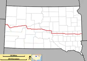 South Dakota Highway 34 (SD 34) is a state route that runs parallel to Interstate 90 across the entire state of South Dakota. It begins at the Wyoming border west of Belle Fourche, as a continuation of Wyoming Highway 24 (WYO 24). The eastern terminus is at the Minnesota border east of Egan, or southwest of Airlie, Minnesota, where it continues as Minnesota State Highway 30 (MN 30). It is just over 419 miles (674 km) in length, making it the longest state highway in South Dakota.