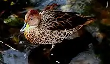 The duck is a distinctive small, mottled, predominantly brown pintail. It is smaller and stockier than the remaining mainland subspecies (A. g. spinicauda), with more uniform and darker plumage.[3] It has a reddish crown, light brown cheeks and throat, dark grey underwings and a pointed tail. The back, breast and flanks are scalloped with buff; the underparts are buffy white, mottled with brown. The bill is yellow with a blue and black line on the culmen and tip, and the feet are greenish-grey. The downy chick is dark brown with yellowish buff markings.[7]