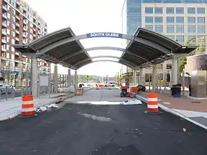 South Glebe is a bus rapid transit station in Arlington, Virginia, located near the intersection of South Glebe Road and South Clark Place. It is a stop along the dedicated bus-only highway portion of the Metroway bus rapid transit line, providing two-way service along the route to southern Crystal City.