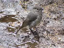 The South Island robin (Petroica australis), also known in Māori as the Kakaruwai.[2], is a sparrow-sized bird found only in New Zealand, where it has the status of a protected endemic species. The birds are sparsely distributed through the South Island and Stewart Island/Rakiura, although the distribution is not continuous. The nominate, and the Stewart Island robin (P. australis rakiura) are the two subspecies. The species is closely related to the North Island robin (formerly P. australis longipes, now considered a distinct species),[3] and also to the extremely rare black robin (P. traversi) of the Chatham Islands.