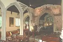 In 1871–72 the architect Ewan Christian restored the chancel and C. C. Rolfe began restoring the nave. Rolfe's cousin H. W. Moore completed the nave restoration in 1887–88.[6] During the restoration extensive 15th century wall paintings were discovered.[5] They include a Doom painting over the chancel arch,[7][8] the seven deadly sins,[9] Saint Michael weighing souls,[10] the Virgin Mary (originally part of an Annunciation scene)[5] and a rare painting of Saint Clement.[11] Burlison and Grylls heavily restored the paintings, re-drawing the weighing of souls at twice its original size.[5] St. James' tower has a ring of eight bells, all of which were cast by Mears & Stainbank of the Whitechapel Bell Foundry in 1907.[12] The church also has a Sanctus bell cast by an unknown founder in about 1399.[12]