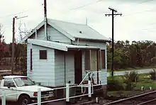 By 1976, with the downturn in traffic, signal boxes remained only at East Greta Junction, Weston, Neath and Caledonia. The double track had been cut back to Caledonia in 1973 with the closure of the lines to Cessnock station & Maitland Main Colliery; the electric staff instruments for the Bellbird branch were transferred to Caledonia signal box. On 27 November 1982 Weston Signal box closed. This was soon followed by the end of double track working on 7 December 1982 when the down line was taken out of use. Electric staff working was then used between East Greta Junction and Neath, and between Neath and Caledonia.[54] Caledonia signal box closed from 10 June 1983 and the section from Neath to Pelton was then worked by Ordinary Train Staff, this was changed to Ordinary Train Staff and Ticket from 18 December 1984. Neath Signal box closed on 3 September 1996, leaving the entire branch from East Greta Junction to Pelton worked as a single section by Ordinary Train Staff and Ticket.[55] The signal box at East Greta Junction remains open.