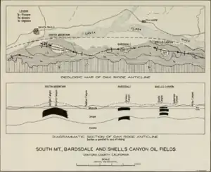 The South Mountain field is one of several oil fields within the Oak Ridge Anticline, a large anticlinal structure upthrown over the Oak Ridge reverse fault. Tectonic forces caused by the collision and lateral movement of the North American and Pacific Plates have compressed the area of the Oxnard and Ventura Basins from north to south, resulting in structural folds; oil has collected in those folds which form an anticlinal trapping mechanism. Extensive faulting is a secondary trapping mechanism, as the fault offsets have brought impermeable rock adjacent to oil-bearing formations, preventing further upward migration of hydrocarbons.[4][5]