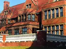 At an annual meeting in 1895, Library Trustees considered the question of obtaining a library building and Eugene V. Connett's offer of a library site on the corner of Scotland Road and Taylor Place, once a $7,500 subscription was met (equivalent to $67,000 in 2021). On May 8, 1896, the library was moved into the building on that corner. A referendum held on April 27, 1926, showed that citizens had voted ten to one in favor of the town taking over full support of the library. It thereupon became "The South Orange Public Library." In February 1929, the Village Trustees passed an ordinance providing funds to construct a rear wing on the library and to provide a Children's Room in the basement, book stacks and a balcony on the floor above, together with rehabilitation work on the older part of the building. In November 1968, the new library building on the corner of Scotland Road and Comstock Place was dedicated.[40]