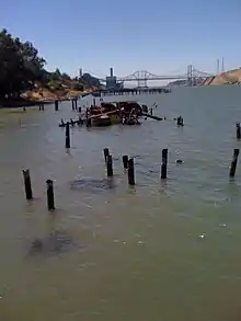 Garden City attempted an eastbound bay crossing during a full gale on Christmas morning, 1921. After steaming into the wind for 90 minutes on what was normally an 18-minute trip, the ferry found its destination slip was occupied by the ferry Edward T. Jeffery seeking shelter from the storm. The other ferry vacated the slip, but Garden City was unable to maneuver in the wind, and started drifting when its rudder broke while attempting to return to San Francisco. A rescue tug arrived and took the ferry in tow, but the tow line parted, and the ferry drifted into the Key system pier. The pier was seriously damaged and the ferry passengers were drenched by waves breaking 20 feet high as they crawled to safety. Southern Pacific retired Garden City the following year; but traffic remained so heavy through the 1920s that the boat was repeatedly pulled out of retirement for temporary service when other boats needed repair. After her last run in 1929, the old ferry was moored as a fishing resort in Eckley, California. Eckley is gone, the site now being part of Carquinez Strait Regional Shoreline Park, and the remains of the Garden City are easily visible from the park's Eckley fishing pier.[17]: 162–166