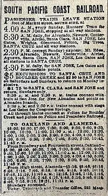 The South Pacific Coast Railroad (SPC) was a 3 ft (914 mm) narrow gauge steam railroad running between Santa Cruz, California and Alameda, with a ferry connection in Alameda to San Francisco. The railroad was created as the Santa Clara Valley Railroad, founded by local strawberry growers as a way to get their crops to market in San Francisco and provide an alternative to the Southern Pacific Railroad. In 1876, James Graham Fair, a Comstock Lode silver baron, bought the line and extended it into the Santa Cruz Mountains to capture the significant lumber traffic coming out of the redwood forests. The narrow-gauge line was originally laid with 52-pound-per-yard (26 kg/m) rail on 8-foot (2.44 m) redwood ties;[1] and was later acquired by the Southern Pacific and converted to 4 ft 8+1⁄2 in (1,435 mm) standard gauge.