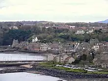 Queensferry, also called South Queensferry or simply "The Ferry", is a town to the west of Edinburgh, Scotland. Traditionally a royal burgh of West Lothian,[3] it is administered by the City of Edinburgh council area. It lies ten miles to the north-west of Edinburgh city centre, on the shore of the Firth of Forth between the Forth Bridge, Forth Road Bridge and the Queensferry Crossing. The prefix South serves to distinguish it from North Queensferry, on the opposite shore of the Forth. Both towns derive their name from the ferry service established by Queen Margaret in the 11th century, which continued to operate at the town until 1964, when the Road Bridge was opened.
