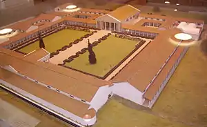 Much of Sussex was a Roman canton of the Regni, probably taking a similar area to the pre-Roman tribal area and kingdom.[25] Its capital was at Noviomagus Reginorum, modern-day Chichester, close to the pre-Roman capital of the area, around Selsey. Sussex was home to the magnificent Roman Palace at Fishbourne, by far the largest Roman residence known north of the Alps. The Romans built villas, especially on the coastal plain and around Chichester, one of the best preserved being that at Bignor. Christianity first came to Sussex at this time, but faded away when the Romans left in the 5th century. The nationally important Patching hoard of Roman coins that was found in 1997 is the latest find of Roman coins found in Britain, probably deposited after 475 AD, well after the Roman departure from Britain around 410 AD.[28]