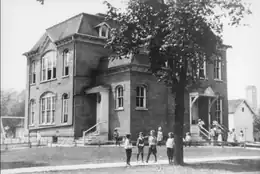 The first South School building was built in 1889, and it consisted of 2 classrooms.[2] A second storey was added on in 1895, and it was considered to be a modern schoolhouse. A new building was planned on the South School property. This new building was also called South School and it was designed by Frank Moulton, of Flad & Moulton,[3] and partially funded by the Works Progress Administration. It served students from the east side of the Baraboo River, and grades kindergarten to 12. The original South School building was torn down, and replaced with tennis courts.[2]