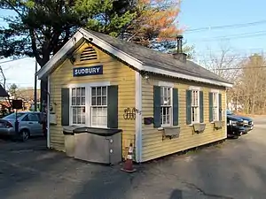 The Massachusetts Bay Transportation Authority was formed in August 1964 to subsidize suburban commuter rail service. On January 18, 1965, services were cut back to the boundaries of the MBTA funding district. Although the MBTA initially intended to discontinue the single remaining trips on the Central Massachusetts Branch and the Lexington Branch, they were kept at the last minute. However, the remaining CM trip was cut from Hudson to South Sudbury.[1][5] On November 26, 1971, the remaining South Sudbury round trip was discontinued due to poor track conditions and dwindling ridership.[1] The circa-1952 station building is still extant, and was in use as a private business, AAA Limousines, until 2019.[2] Part of the platform and a station sign reading "Sudbury" remain at the building.