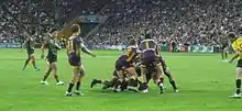 In 1965 a talented young side made the Grand Final against St. George who were aiming to secure their tenth straight premiership. The young Rabbitohs were not overawed by the Dragons' formidable experience and in front of a record crowd of 78,056[11] at the Sydney Cricket Ground, they went down narrowly 12–8.[12] The nucleus of this side went on to feature in Australian representative teams for the next six years and ensured another golden period for South Sydney making five successive grand finals from 1967 to 1971, winning four. Bob McCarthy, John O'Neill, Eric Simms, Ron Coote, Mike Cleary and John Sattler from 1965 were later joined by Elwyn Walters, Ray Branighan, Paul Sait, Gary Stevens and coach Clive Churchill to form a fearsome combination before internal strife and poaching by other clubs from 1972 onwards unravelled the star studded pack.[13] From this period comes part of South's and Australian Rugby League folklore when in the 1970 premiership decider against Manly, captain John Sattler inspired the side to victory playing out 70 minutes of the match with his jaw broken[14] in three places after being king hit by Manly prop John Bucknall.[15][16]