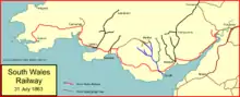 The South Wales Railway (Welsh: Rheilffordd De Cymru) was a main line railway which opened in stages from 1850, connecting the Great Western Railway from Gloucester to South Wales. It was constructed on the broad gauge. An original aspiration was to reach Fishguard to engender an Irish ferry transit and transatlantic trade, but the latter did not materialise for many years, and never became an important sector of the business. Neyland was the western terminus of the line until 1906.