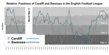 The South Wales derby is a local derby between Welsh association football clubs Cardiff City and Swansea City. The fixture has been described by The Independent as one of the fiercest rivalries in British football.[1] Although based in Wales, both clubs play in the English football league system and have won English honours: Cardiff the FA Cup in 1927 and Swansea the Football League Cup in 2013.