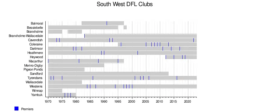 | Jumper | Club | Nickname | Years in comp | SWDFL Premierships | Premiership Years |