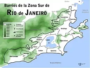 The South Zone (Portuguese: Zona Sul - Portuguese pronunciation: [ˈzonɐ ˈsuw]) is an area of the city of Rio de Janeiro situated between the Tijuca Massif, the Atlantic Ocean and Guanabara Bay. Most of it is made up of neighborhoods along the Atlantic coastline, such as São Conrado, Vidigal, Leblon, Ipanema, Copacabana, and Leme.