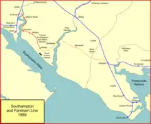 The Gosport branch was from a junction on the main line at Bishopstoke, later renamed Eastleigh. The LSWR next built a railway to reach Portsmouth more directly, but curving round the head of Portsmouth Harbour. Fierce competition with the London, Brighton and South Coast Railway[note 1] made collaboration difficult for a time, but it was agreed to build a joint railway on Portsea Island.[3] The LSWR built a branch from Fareham, on the Gosport line, to Cosham, and the LBSCR built from there to Portsmouth and made that section joint. These lines, connecting Fareham and Portsmouth, and Fareham and Havant, opened in 1848.[3][4]