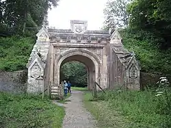 The railway was completed and opening was being planned for 1 June 1847;[9] but on 2 May 1847 there was a collapse of the newly constructed railway tunnel at Southampton. The damage extended about 100 yards (90 m) and opened to the surface near the western end of the tunnel; it was caused by disturbance to the ground created around the route of the old Southampton and Salisbury Canal tunnel through which the new tunnel had cut.[10][7][11][12] This was quickly restored, and on 20 May Captain Coddington conducted the formal inspection of the route, which continued the next day. He was satisfied with the standard of workmanship of the line, but commented adversely on the narrow opening of the overbridges, and the fact that the entire line west of Redbridge was single: the longest such length in England, he thought. He also criticised the sharp curve at Northam where the line joined the existing LSWR route; the company agreed to alter the curve to a larger radius. The public opening was planned for 1 June,[9] but on 30 May the interior of the Southampton tunnel suffered further problems, with a large bulge in the walls indicating a section was sinking.[7] With no connection to the mainline to London, the Blechynden terrace station was the terminus; the LSWR had to transport their locomotives there by road through the streets of Southampton.[3][12] The Poole branch (to Lower Hamworthy) opened at the same time.[9]