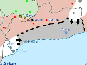 The AQAP was beginning to take parts of other remaining areas of southern Abyan from the beginning of February, when they entered Ahwar and other towns. During the fight for Awhar, 3 AQAP fighters were killed by Southern Movement fighters in a fight in a checkpoint.[5][6] The major offensive began in the dawn of the 20 February, with the AQAP first taking Ahwar, then Shuqrah, in one day fighting, that resulted to the death of 3 Hadi government loyalists. Also on the same day, AQAP attacked the new base of the Hadi government in the port city of Aden, killing one tribal leader and one of his bodyguards. After the tribal fighters abandoned the southern Abyan, and headed for the north, AQAP set up their flags in the government building, establishing a sharia court, and an Emirate, that is led by Tawfiq Belaidi, the brother of Abu Hamza al-Zinjibari, who was killed in a U.S. drone strike on 3 February.[7][8]