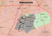 The Southern Damascus offensive (March 2018) started on 12 March 2018, when ISIL began attacking rebel positions in the al-Qadam neighborhood of southern Damascus as they were evacuating.[11] The rebel pocket in al-Qadam had been surrounded on one side by government forces and on the other by ISIL.[12] On 10 March, ISIL threatened to kill any rebels that evacuate from the area after the Syrian government gave the rebels 48 hours to surrender the district and evacuate.[13] Following news of the upcoming rebel evacuation from al-Qadam, ISIL forces attacked the rebels on 12 March and captured 25 percent of the neighborhood.[11] The next day, around 300 rebel fighters and their family members were evacuated from al-Qadam to rebel territory in Idlib province.[12] After the evacuation, government troops took control of 70 percent of the neighborhood, while the remaining 30 was under IS control.[14] During the fighting, government air-strikes were conducted against ISIL in Al-Hajar al-Aswad and al-Qadam.[15] While the clashes were taking place in Qadam, rebel groups attempted to break through ISIL lines in Yarmouk but were repelled.[16]