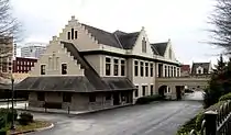 The passenger terminal station and express depot, both designed in the same vernacular style with Classical Revival influence, were completed in 1903 and 1907, respectively,[1] and are notable for their signature corbel-stepped gabled roofs. The terminal building is two-and-a-half stories, with the lower level originally containing the dining rooms, baggage check, express and mail rooms, and the upper level originally housing the ticketing and waiting rooms. A bridge connects the upper level with Depot Avenue. The building originally included a clock tower, which was removed in 1945, apparently due to structural problems.