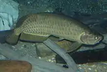The southern saratoga (Scleropages leichardti), also known as the spotted bonytongue, spotted saratoga, or simply saratoga, is a freshwater bony fish native to Australia. It belongs to the subfamily Osteoglossinae, or arowanas, a primitive group of teleosts. Like all arowanas, it is a carnivorous mouthbrooder. Along with the gulf saratoga (Scleropages jardinii), the saratoga is also known as the Australian arowana (mainly by non-Australian aquarists) and barramundi, although the latter name is nowadays reserved in Australia for the unrelated Lates calcarifer.