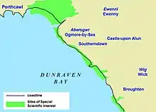 The 153 hectares (380 acres) stretch of shore, cliff, cliff-top, and several short, steep valleys, are designated an SSSI for their geological and botanical value.[2] The cliffs expose the Jurassic geological strata and some of the underlying Carboniferous Limestone, the latter dating from between 359 to c. 330 million years ago. By the Triassic period, 200 million years ago, the Carboniferous rocks had already been tilted and eroded.[2] A new deposition phase created more sedimentary rocks, including a red Triassic conglomerate, and a creamy white Jurassic limestone known as Sutton Stone, a freestone much sought-after for carved stonework, and so widely quarried where it occurs.[1] The SSSI is in two parts. The northern section is the wave-cut platform alongside Ogmore-by-Sea. The southern section, with a short gap, covers both the intertidal areas and the cliffs and grassy cliff-tops of Dunraven Bay, Trwyn y Witch headland and the valleys and shoreline of Cwm Mawr and Cwm Bach.[2] The whole length of the SSSI is traversed by the South Wales section of the Wales Coast Path.[3]