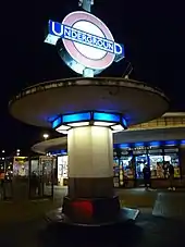 The station is built in the Art Deco/Streamline Moderne design style using brick, reinforced concrete and glass and is one of the best known of the many stations Charles Holden designed for London Underground. The station building is circular with a flat projecting concrete roof. Externally, the flat roof of the raised central section appears, impossibly, to be supported by nothing more than a horizontal band of windows that provide daylight to the ticket hall. The roof is actually supported, umbrella-like, from a central column within the ticket hall. The whole building is topped by an illuminated feature resembling a Tesla coil, designed to look as if it is taken from Frankenstein's laboratory.[12]