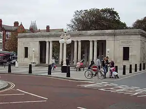 Southport War Memorial is in London Square, Lord Street, Southport, Merseyside, England. It consists of an obelisk flanked by two colonnades in the form of Greek temples. Outside the colonnades are memorial gardens, each containing a Pool of Remembrance and fountains. The memorial was designed by the local architects Grayson and Barnish, and the carving was executed by Herbert Tyson Smith. It was unveiled in 1923 by the Earl of Derby. Following the Second World War and subsequent conflicts further inscriptions and names have been added. The memorial is recorded in the National Heritage List for England as a designated Grade II* listed building.