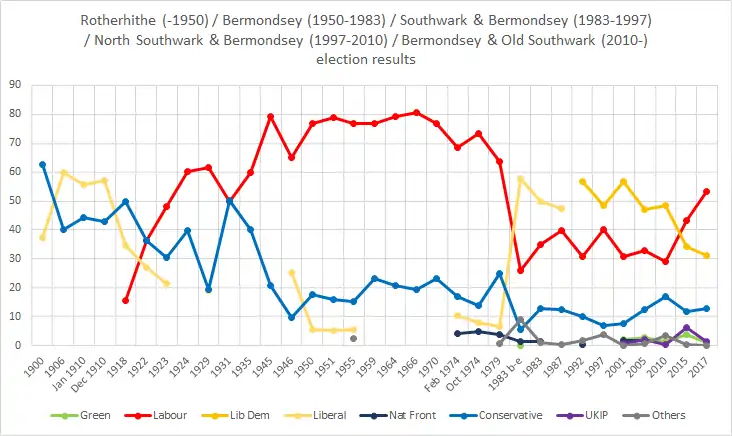 The area sustained heavy damage in the London Blitz including 1,651 high-explosive bombs across the wider borough,[3] taking decades to rebuild. Relatively poorly paid dock work rapidly evaporated to leave a labour shortage and local work included settings of low-skilled/paid warehouses, railway yards, buses/trams/taxis, civil infrastructure, and many people employed in the lower-paid public service careers, construction etc. within the aftermath of World War II. This was coupled with major social housing projects throughout inner south London in schemes ranging from cheap brutalist steel-and-glass fronted or plain concrete towers to semi-classical or green landscaped part-brick and concrete mid-rise apartment blocks. The forerunner seat of Bermondsey (created 1950) saw low right wing (i.e. Conservative/Unionist/Constitutionalist/Liberal National) support, rising marginally from 15.8% in 1951 to a peak of 24.9% in 1979.