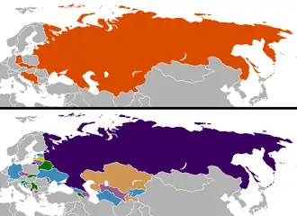 Post-1991 usage of the term "Eastern Bloc" may be more limited in referring to the states forming the Warsaw Pact (1955–1991) and Mongolia (1924–1992), which are no longer communist states.[8][9] Sometimes they are more generally referred to as "the countries of Eastern Europe under communism",[10] excluding Mongolia, but including Yugoslavia and Albania which had both split with the Soviet Union by the 1960s.[11]