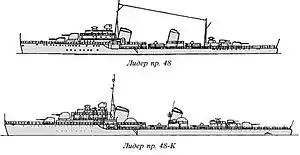 The Kiev class (Russian: Киев) (officially designated as Project 48) was designed in 1939 for the Soviet Navy as a smaller class of destroyer leaders after the cancellation of the Tashkent-class ships that had been intended to be built in the Soviet Union. Only three ships were begun; one was cancelled and scrapped before the Axis invasion in mid-1941 and construction of the other two was suspended during the war. The navy considered completing them under a new Project 48-K configuration afterwards, but decided against that as they would have been competing against a more modern design that lacked the stability problems that the 48-K design would have had. The Soviets either scrapped them or used them as targets.