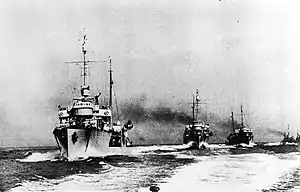 After returning to Poti on 5 February, Nezamozhnik and two patrol boats escorted a tanker from Poti to Tuapse, delivering reinforcements and ammunition on 10 February. A shore bombardment of Anapa during which fifty shells were fired on 26 February became her last combat action, and from 1 March the destroyer was under refit, which lasted until the end of the Black Sea campaign. After the sinking of Kharkov and two destroyers in October, Stalin forbade the Black Sea Fleet cruisers and destroyers from participating in operations without his express permission. Nezamozhnik and Zheleznyakov served as part of the force escorting Krasny Kavkaz from Batumi to Poti on 15 July 1944. On 30 July, Nezamozhnik and Zheleznyakov sailed from Poti under escort from two patrol boats and nine aircraft for radar equipment tests, which proved unsatisfactory.[19] The destroyer was transferred back to the 1st Destroyer Division on 22 August along with Zheleznyakov when the 2nd Destroyer Division was disbanded. On that day, both destroyers returned to Novorossiysk from Poti under the cover of two MBR-2s.[20] After the port of Sevastopol was swept for mines following its recapture during the Crimean Offensive earlier that year, the Black Sea Fleet returned to Sevastopol. Nezamozhnik departed Poti on 4 November and arrived at the main base on the next day.[17] By the end of the war, the ship was officially credited with completing 120 combat missions, sailing 45,586 nmi (84,425 km; 52,459 mi) in 3,779 running hours, surviving sixty air attacks, downing three planes, and destroying five field, two coastal, and four mortar batteries.[21] For these actions, she was awarded the Order of the Red Banner on 8 July 1945 along with Zheleznyakov.[4][3]