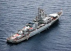 The ship had a well-equipped sensor suite, including a single MR-310A Angara-A air/surface search radar, Don navigation radar, the MP-401S Start-S ESM radar system and the Spectrum-F laser warning system. Fire control for the guns consisted of a MR-143 Lev-214 radar. An extensive sonar complex was fitted, including MG-332T Titan-2T, which was mounted in a bow radome, and MG-325 Vega.[10] The latter was a towed-array sonar specifically developed for the class and had a range of up to 15 kilometres (9.3 mi).[11] In addition to the PK-16 decoy-dispenser system, the vessel was equipped with an additional eight-tube decoy system aft specially developed for point-defence against missiles.[12]