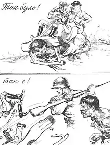 The response of non-ethnic Poles to the situation caused considerable complications. Many Ukrainians, Belarusians and Jews welcomed the invading troops.[101] Local Communists gathered people to welcome the Red Army troops in the traditional Slavic way by presenting bread and salt in the eastern suburb of Brest. A sort of triumphal arch on two poles, decked with spruce branches and flowers was fashioned for this occasion. A slogan in Russian on a long red banner, glorifying the USSR and welcoming the Red Army, crowned the arch.[102] The event was recorded by Lev Mekhlis, who reported to Stalin that the people of the West Ukraine welcomed the Soviet troops "like true liberators".[103] The Organization of Ukrainian Nationalists rebelled against Polish rule and Communist partisans stirred up local revolts, such as in Skidel.[1]