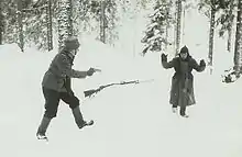 Hostilities between Finland and the Soviet Union ceased in September 1944, and the first Soviet POWs were handed over to the Soviet Union on 15 October 1944. The transfer was complete by the next month.[18] Some of the POWs escaped during the transportation, and some of them were unwilling to return to the Soviet Union. Furthermore, Finland handed over 2,546 German POWs from the Lapland War to the Soviet Union.[19]