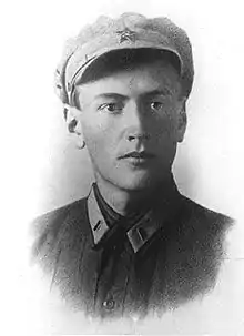 The Katyusha rocket launchers were top secret in the beginning of World War II, however only forty launchers had been built.[31] A special unit of the NKVD troops was raised to operate them.[32] On July 14, 1941, an experimental artillery battery of seven launchers was first used in battle at Rudnya in Smolensk Oblast of Russia, under the command of Captain Ivan Flyorov, destroying a concentration of German troops with tanks, armored vehicles and trucks at the marketplace, causing massive German Army casualties and its retreat from the town in panic,[33] see also in articles by a Russian military historian Andrey Sapronov,[34][35] an eyewitness of the maiden launches. Following the success, the Red Army organized new Guards mortar batteries for the support of infantry divisions. A battery's complement was standardized at four launchers. They remained under NKVD control until German Nebelwerfer rocket launchers became common later in the war.[36]
