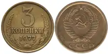 In 1935, the reverse of the 10-, 15-, and 20 kopeck coins were redesigned again with a simpler Art Deco inspired design, with the obverse of all denominations also redesigned, having the "Workers of the world, unite!" slogan dropped. The change of the obverse designs did not affect all 1 kop, 2 kop, 3 kop, and 5 kop coins immediately, as some 1935 issues bore the "Workers of the World" design while some bore the new "CCCP" design. The state emblem also went through a series of changes between 1935 and 1957 as new soviet republics were added or created, this can be noted by the number of "ribbons" wrapped around the wheat sheaves. This coin series remained in circulation during and after the monetary reform of 1947 and was finally discontinued in 1961.