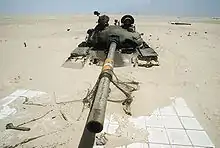 Most non-Republican Guard armored units had older tank designs, but the 3rd Armored Division had a number of T-72 tanks, the only non-Republican Guard force to have them,[72] while the other armored battalions had T-62s and upgraded T-55s.[73] During the battle of Khafji, these upgraded T-55s survived impacts from Milan anti-tank missiles.[74] As the units moved to the Saudi border, many were attacked by Coalition aircraft. Around the Al-Wafrah forest, about 1,000 Iraqi armored fighting vehicles were attacked by Harrier aircraft with Rockeye cluster bombs.[75] Another Iraqi convoy of armored vehicles was hit by A-10s, which destroyed the first and last vehicles, before systematically attacking the stranded remainder.[76] The air raids destroyed many tanks and support vehicles and prevented the majority of the Iraqi troops deployed for the offensive from taking part in it, allowing Saudi and Quatari forces to retake the city.[77]