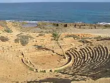The well-preserved Greek theatre stands facing the sea outside the old city walls. This monument dates to the 3rd century BC and is therefore one of the oldest sites in Apollonia. The structure was modified under Domitian, suggesting its use as an arena for gladiatorial fights.[10] The 5th century saw the abandonment of the theatre and the re-use of the columns from the stage as spolia in the eastern basilica. The cavea has 28 seat levels.