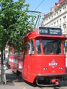 SpåraKoff is a HM V type tram converted into a mobile bar in Helsinki, Finland. Known as the pub tram, the vehicle does circular tours of downtown Helsinki picking up passengers for a fee during summer months. It is operated jointly by Sinebrychoff, HOK-Elanto (part of the S Group), and Helsinki City Transport.[1]