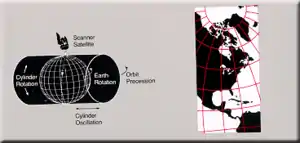 The space-oblique Mercator projection (SOM) was developed by John P. Snyder, Alden Partridge Colvocoresses and John L. Junkins in 1976. Snyder had an interest in maps, originating back to his childhood and he regularly attended cartography conferences while on vacation. In 1972, the United States Geological Survey (USGS) needed to develop a system for reducing the amount of distortion caused when satellite pictures of the ellipsoidal Earth were printed on a flat page. Colvocoresses, the head of the USGS's national mapping program, asked attendees of a geodetic sciences conferences for help solving the projection problem in 1976.[1] Snyder attended the conference and became motivated to work on the problem armed with his newly purchased pocket calculator and devised the mathematical formulas needed to solve the problem. After submitting his calculations to Waldo Tobler for review, Snyder submitted these to the USGS at no charge. Impressed with his work, USGS officials offered Snyder a job with the organization, which he accepted.[1] His formulas were used to produce maps from Landsat 4 images launched in the summer of 1978.