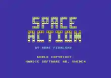 Space Action is a horizontally scrolling shooter created for the Commodore 64 by Arne Fernlund.[3] The game took three months to develop and was distributed on cartridge by the Swedish company Handic. More than 10,000 copies were sold world-wide. The game became popular in Italy, where about 7,000 of the copies were sold, and was also a minor success in Australia.[1]