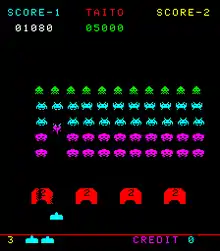 Space Invaders Part II[lower-alpha 1] is a 1979 fixed shooter arcade game developed and published by Taito. In North America, it was distributed by Midway Games as Space Invaders Deluxe. It is the sequel to Space Invaders (1978). The player controls a laser base that must destroy formations of descending aliens, while avoiding their projectiles. New features have been added, such as aliens that split into two when shot, an increased high score limit with the player able to save their name as initials, and short cutscenes in-between stages. It runs on the Taito 8080 arcade system.