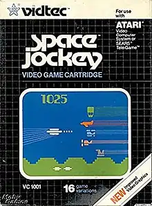 Space Jockey is a horizontally scrolling shooter designed by Garry Kitchen for the Atari VCS (renamed to the Atari 2600 later in the year). It was published under the Vidtec brand of U.S. Games in 1982[4] as the initial release from the company.[3] The game shipped on a 2K cartridge at a time when most VCS games were 4K.[5] Atari, Inc. stopped internal development of 2K games for the console in 1980.[6]