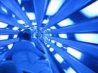 From April 19, 2009 to November 21, 2009, Space Mountain received a major refurbishment.[11][12][13] It was the first extensive renovation since a previous closure in September 1999,[13] and was estimated to cost $12.3 million.[14] The refurbishment gave a ride a sci-fi futuristic look similar to the Tokyo Disneyland counterpart.[15] While the ride experience itself was unchanged, the sound effects in the energy and wormhole tunnels were updated, and an on-ride camera was installed on the turnarounds from the energy tunnel to the lift hill. The most significant change to the ride was in the loading station. The loading station, which originally had no ceiling, was roofed over, to reduce the amount of light visible inside the dome (the TTA's exit from the mountain was also modified with an extended wall, to achieve a similar effect). Gates were also added to the platform where guests board the trains.